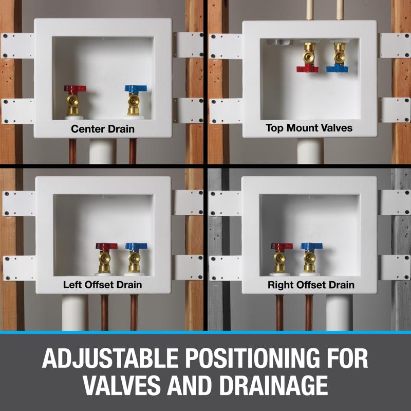 Oatey® Quadtro® Washing Machine Outlet Boxes are available for commercial and residential applications that require supply valves and waste drain recessed into the wall.