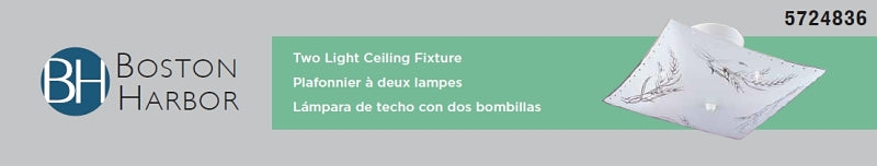 Two light ceiling fixture has a white finish and white wheat design glass shade. Measures 11-1/4 in L x 11-1/4 in W x 5-1/4 in H. Uses 2 x 60W maximum type A19 Medium base bulb or 2 x 13W CFL bulb (not included). ETL Listed.