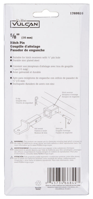 Vulcan HP-58 Hitch Pin, 5/8 in Dia Pin, 5 in OAL, Steel, Zinc