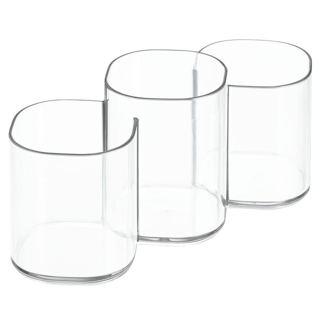 The InterDesign Clarity Cosmetic Trio Cup is the perfect way to keep your vanity organized. Made of clear plastic with 3 compartments, it's perfect for tall brushes and applicators, eyeliners, and lip glosses.