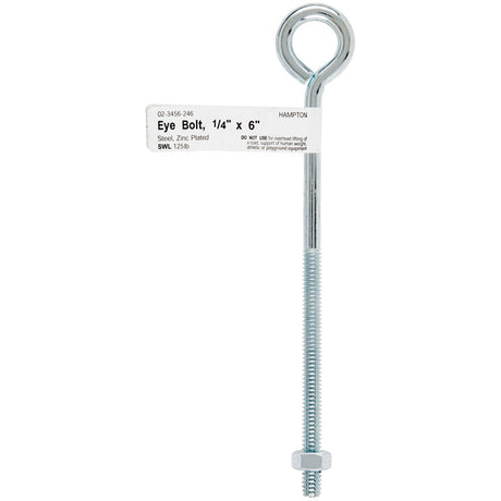 $47.90$47.95Unit price /UnavailableIn stock (1346 units)Hampton 1/4 in. X 6 in. L Zinc-Plated Steel Eyebolt Nut Included, Pack of 10