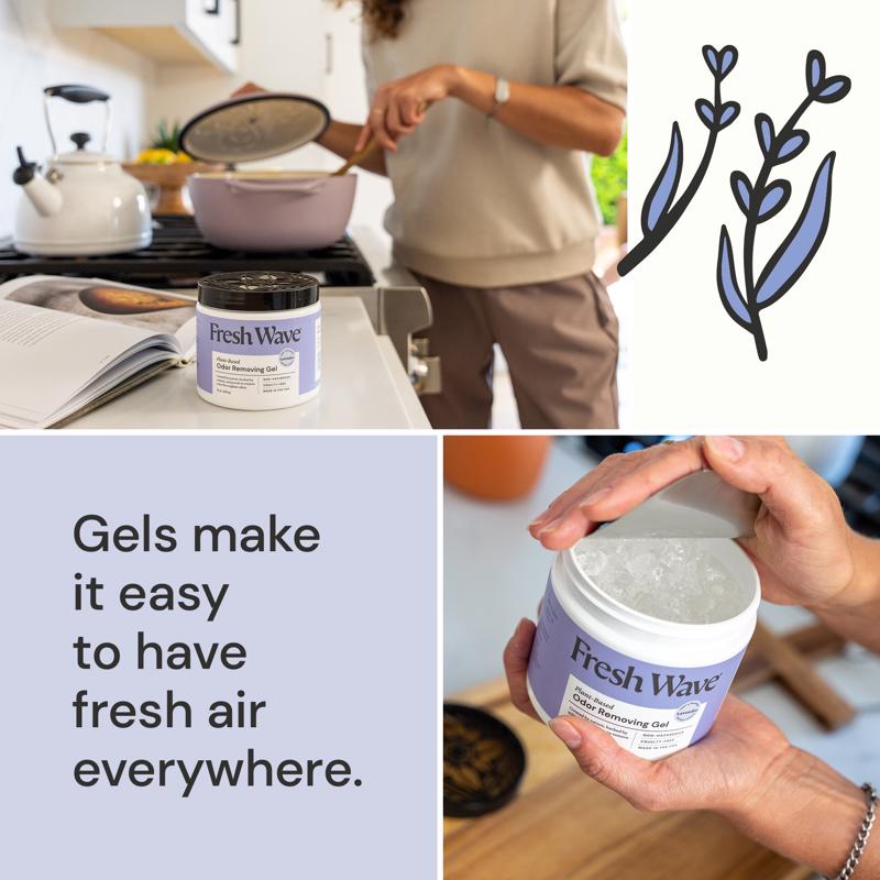 Fresh Wave Gel completely removes odors using safe, natural ingredients – no toxic chemicals or fake fragrances. Each container includes powerful gel that continuously eliminates smells and leaves a light scent of lavender oil. *   * Open and remove seal. Replace slotted lid and place Gel where odors are strongest. Just like odors, Gel disappears as it evaporates. Now you can remove odors with lasting lavender essence.  Removes odors from pet areas, garages, basements and storage, bathrooms, kitchens, boats, RVs, and smoking areas
