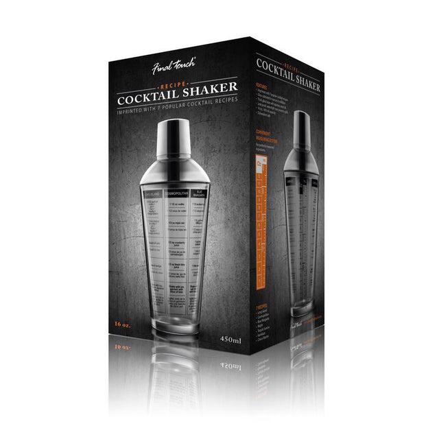 Mix up some classic cocktails in this shaker with 7 popular recipes imprinted right onto the glass. The brushed stainless steel lid with watertight seal prevents spills. Imprinted recipes include; Long Island, Cosmopolitan, Blue Margarita, Mojito, Tequila Sunrise, Kamikaze & Chocolate Martini.