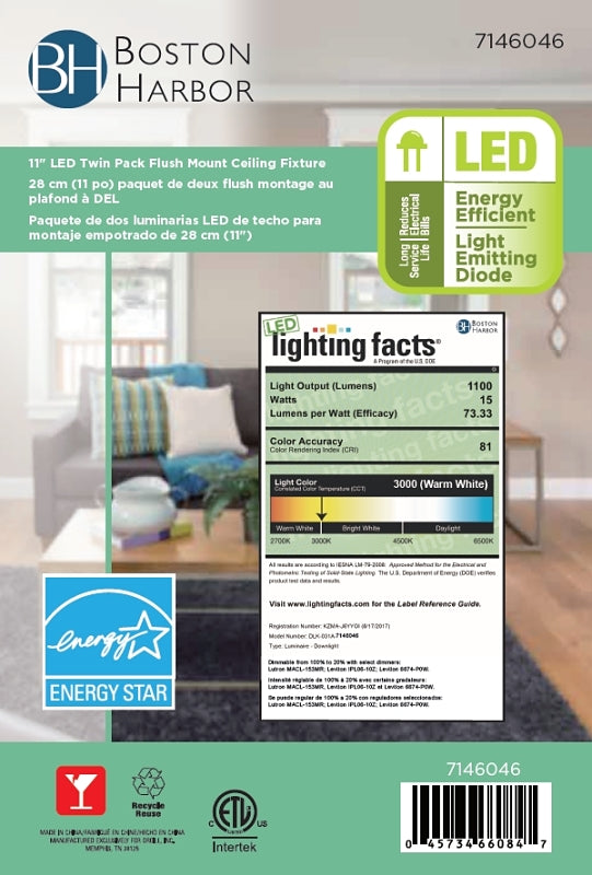 Boston Harbor 4200-LED- WH Flush Mount Ceiling Fixture, 120 V, 15 W, 2-Lamp, LED Lamp, 1100 Lumens, White Fixture