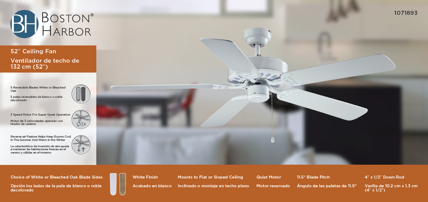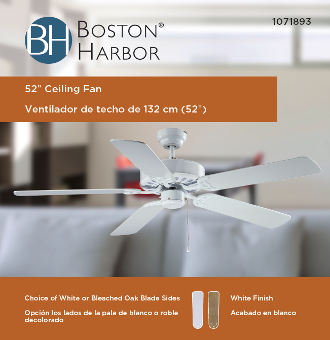 Boston Harbor 52-CASA-ES-EN-WH Ceiling Fan, 5-Blade, Bleached Oak/White Blade, 52 in Sweep, MDF Blade, 3-Speed