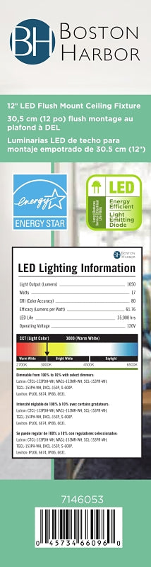 Boston Harbor CL200AC Flush Mount Ceiling Fixture, 120 V, 15 W, 1-Lamp, LED Lamp, 1050 Lumens, 3000 K Color Temp