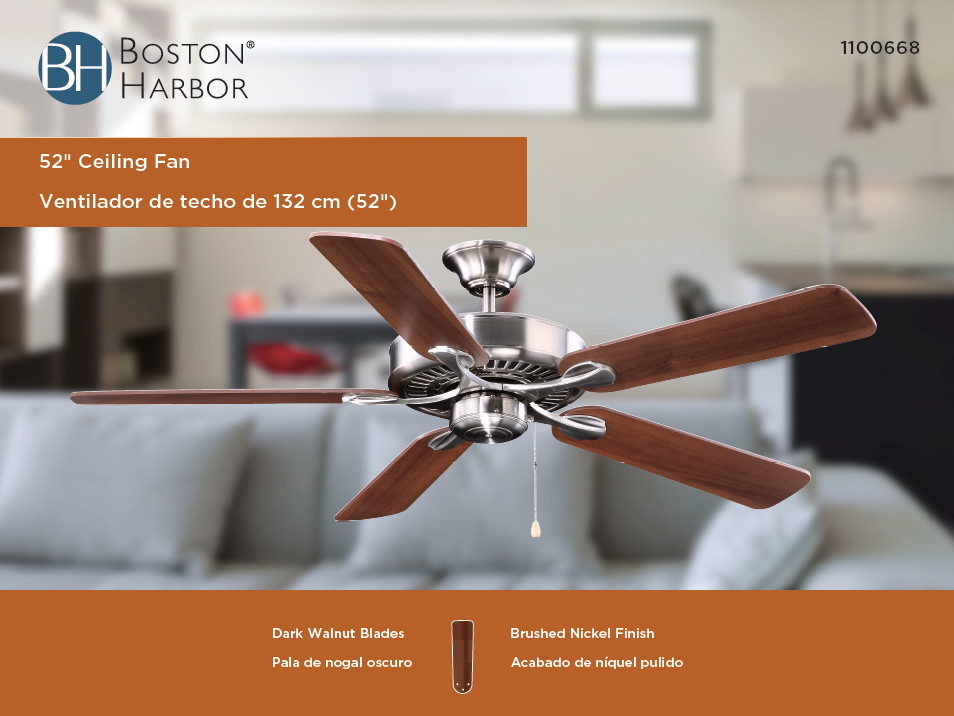Boston Harbor YG314-ES-EN-BN Ceiling Fan, 5-Blade, Dark Walnut Blade, 52 in Sweep, MDF Blade, 3-Speed is backordered and will ship as soon as it is back in stock.