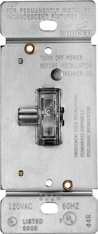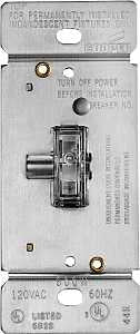 Easy to install. Toggle element provides smooth, positive motion for dimming and On/Off control. 6 in pre-stripped wire leads for fast, easy wiring. Ground lead provided. Aluminum strap dissipates heat and does not require de-rating. Easily located in the dark. 600 W maximum. UL listed.