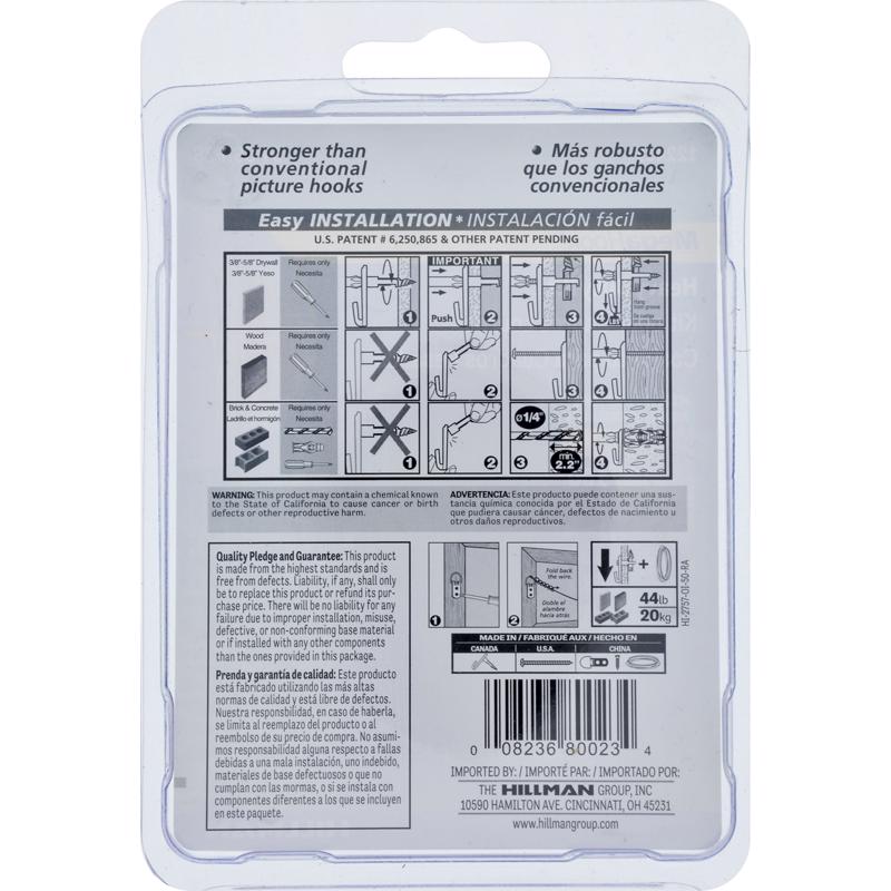 Hillman Heavy Duty MegaHook Kit secures wall decor up to 100lbs. in drywall and 150lbs in wood. Easy to install simply, place the MegaHook in the desired location, drill MegaHook into wall, then set the large brass screw inside MegaHook, drill until secure. *