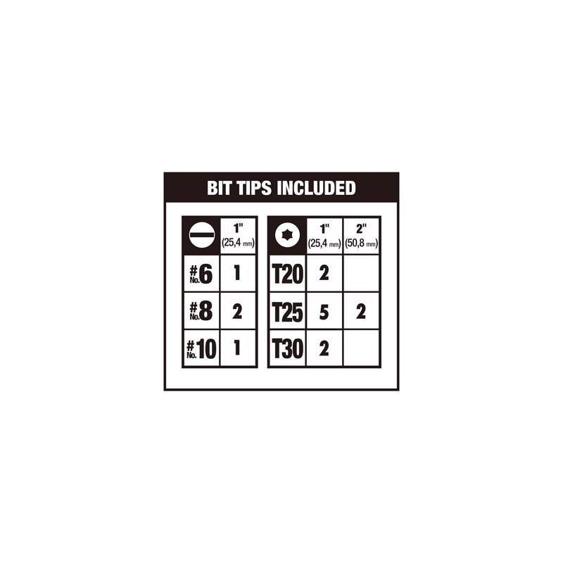 • What's Included:Bit Sizes: PH1, PH2, PH3, TX10, TX15, TX20, TX25, TX30, SQ1, SQ2, SQ3, SL6, SL8, Nut Driver Sizes: 1/4 in. and 5/16 inch