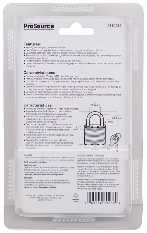 ProSource HD00012-3L Padlock, Standard Shackle, 1/4 in Dia Shackle, 1-1/4 in H Shackle, Steel Shackle, Steel Body