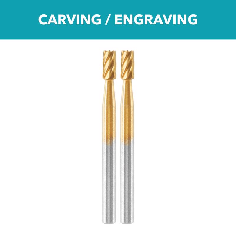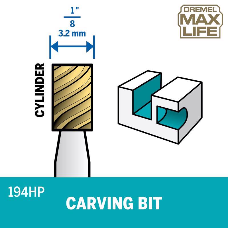 Dremel's line of Max Life High-Performance accessories provides long-lasting performance and impressive durability. Built to give Doers longer lasting, stronger performing, versatile accessories. The Max Life 194HP Carving Bit is coated engineered to last 2X longer than the standard, non-coated model 194 bits. For use with all Dremel high-speed rotary tools, the 1/8 In. (3.2 mm) high-speed cutter works well for detailed material removal in applications like shaping, carving, engraving, hollowing, precision cutting, grooving, slotting, inlaying, making tapered holes or freehand routing. The cylinder shape of the carving bit allows for deep removal of material, cuts flat areas, round edges and makes stop cuts and V-cuts. The accessory tip makes flat bottom slots and grooves, flat side cuts, and makes V-cuts when held at 45-degrees.