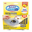 Sani Stick the concentrated cleaning and sanitation sticks you drop in the drain once a month to prevent backups, clogs and nasty odors before they start. Keep Your Drain Pipes Clear and Odor-free All Year Long! Now in a New Lemon Fresh Scent! Perfect for the kitchen, vanity, bathtub and utility/mop sinks. Safe for septic tanks. Includes enough Sani Sticks to treat 2 drains for one year.