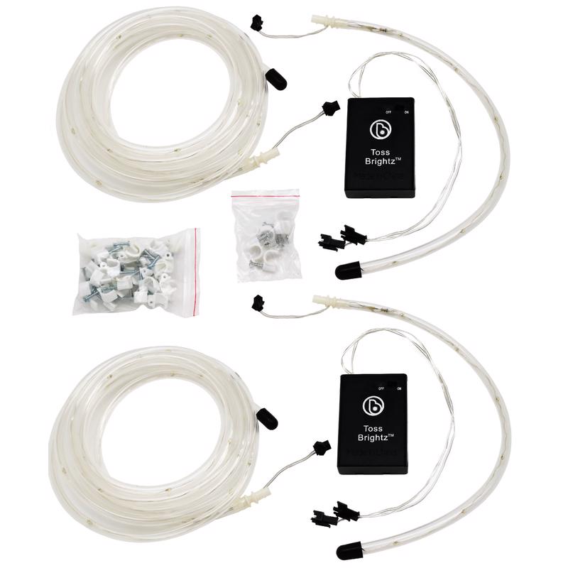 Enjoy your toss board game into the night by lining your boards with diamond-bright LEDs. Each package includes four strings of lights for two regulation-sized cornhole boards (or smaller). Lights strings are weather resistant and come with attached battery packs that provide 24+ hours of light. Batteries not included.