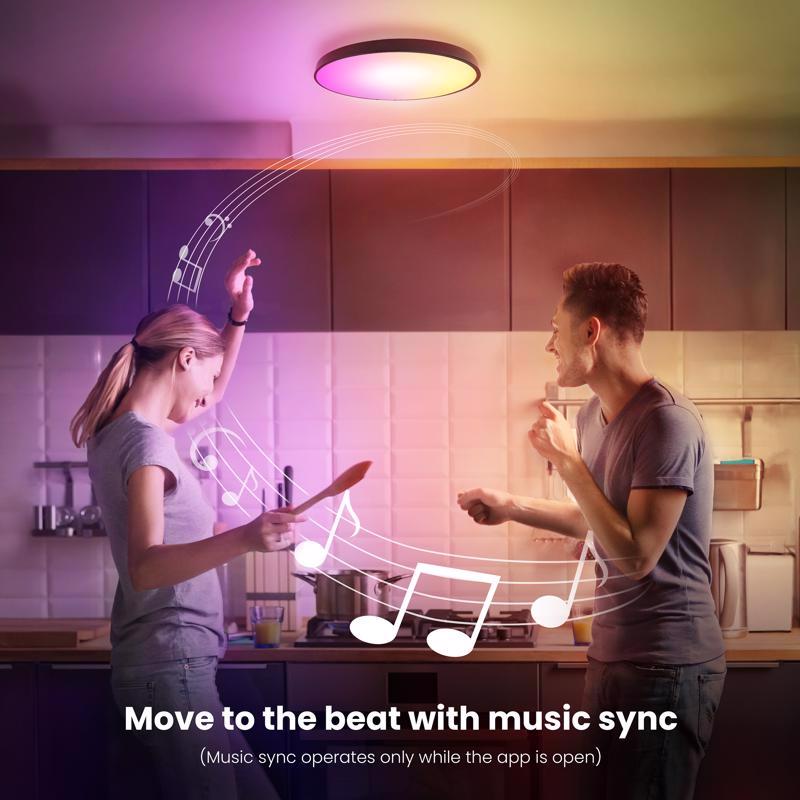 The Feit Electric 15-inch Smart Flush Mount Ceiling Light is the perfect fusion of style, convenience, and innovation. It combines sleek design with smart technology. Flush mountable, it conveys a modern charm with its matte black finish and frosted lens. It emits up to 1600 lumens of LED light, brightening up spaces while still being energy efficient. Unlike most smart devices, this light functions as a conventional light after pairing times out. Enjoy it on its own or enable smart features. For full control over your colors and settings, pair it with the free Feit Electric app on a 2.4GHz Wi-Fi network. Use your favorite smart device to turn lights on/off, dim, and set groups and schedules from anywhere. Choose energizing daylight or wind down with relaxing soft white light. Get creative with millions of colors. Smart connectivity lets you create the perfect ambiance to suit any occasion. Sync your lights to the rhythm of your favorite tunes using the Music Match feature. Turn any gathering into a captivating light show. Installation is quick and easy, with all necessary hardware and safety cables included. Embrace the future of lighting with Feit Electric's smart ceiling light. Elevate your home lighting experience.