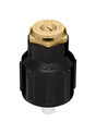 The Plastic Shrub Head has a quarter-circle pattern brass nozzle with a flow-adjustment screw to adjust spray distance and water flow