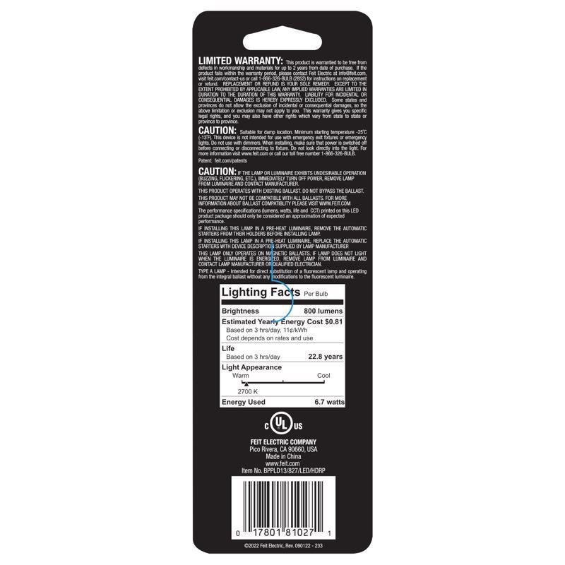 Upgrade your existing 9W PL fixtures to advanced LED energy-saving technology with the Commercial Electric BPPL9/827/LEDG2/HDRP Twin Tube LED Bulb. This 2-pin LED bulb has an output of 600 lumens and a cool 2700k Soft White light, ideal for creating a relaxing, comfortable mood in living rooms and bedrooms. It uses only 5 watts of electricity -- up to 44% less than equivalent standard fluorescent bulbs. Commercial Electric G23 Twin Tube PL replacements keep cool regardless of the atmosphere, giving them an average life span of 25,000/22.8 years. They are RoHS compliant and are 100% mercury free, for safer handling and easy disposal. Installation is easy: no ballast replacement or LED driver installation is required. Choose a dependable, general-purpose lighting bulb for residential or commercial applications by choosing Feit Electric.