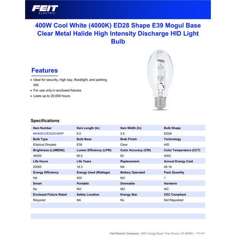 Feit 400 W ED28 HID Bulb 36000 lm Bright White Metal Halide 1 pk