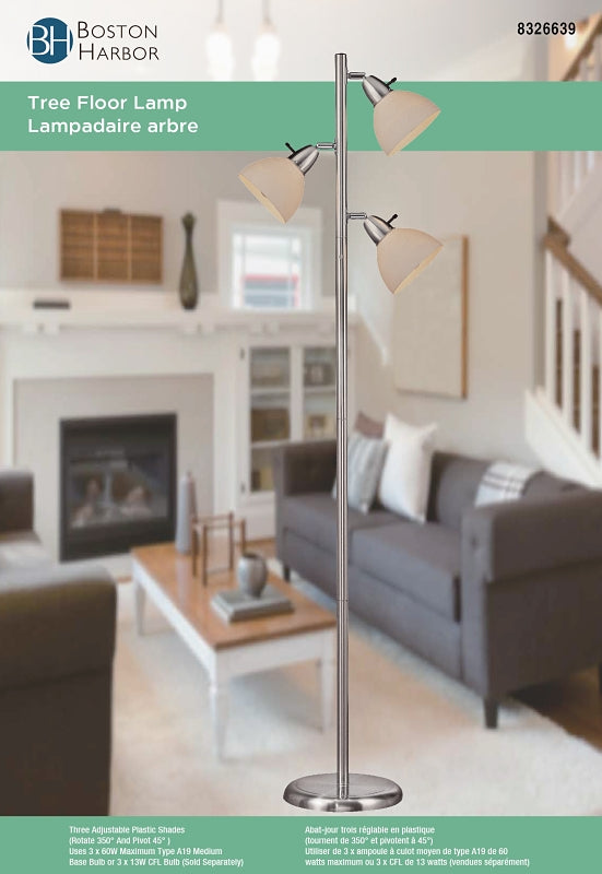 Boston Harbor TL-TREE-648 Tree Lamp, 120 V, 180 W, 3-Lamp, Incandescent Lamp, Metal, Brushed Nickel Finish