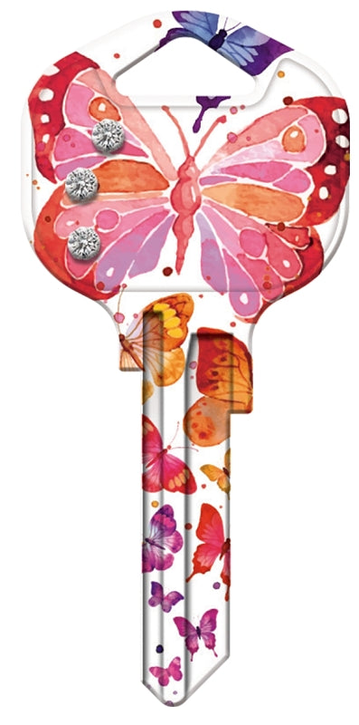 Hy-Ko Key Blank, Design/Theme: Butterfly Bling, Key Number: KW1, Brass, Pink, Nickel-Plated, Dimensions: 2 in W x 1/4 in D x 4 in H, Suitable for: Kwikset KW1 Keyways