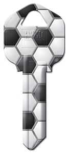 Hy-Ko Key Blank, Design/Theme: Soccer, Key Number: KW1, Brass, Nickel-Plated, Dimensions: 0.87 in W x 0.08 in D x 2.05 in H, Suitable for: Kwikset KW1 Keyways
