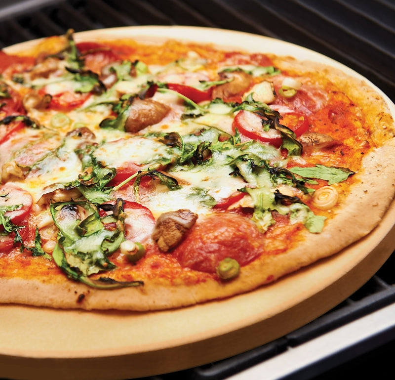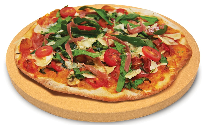 The 15 in Dia ceramic composite grilling and pizza stone is ideal for high temperature baking on your grill, the composite resists moisture or temperature related cracking. The extra thick 3/4 in stone provides more even heat and better insulation from the direct flames. Do not season with oil!. Rinse with water and a little mild detergent only, dry immediately.
