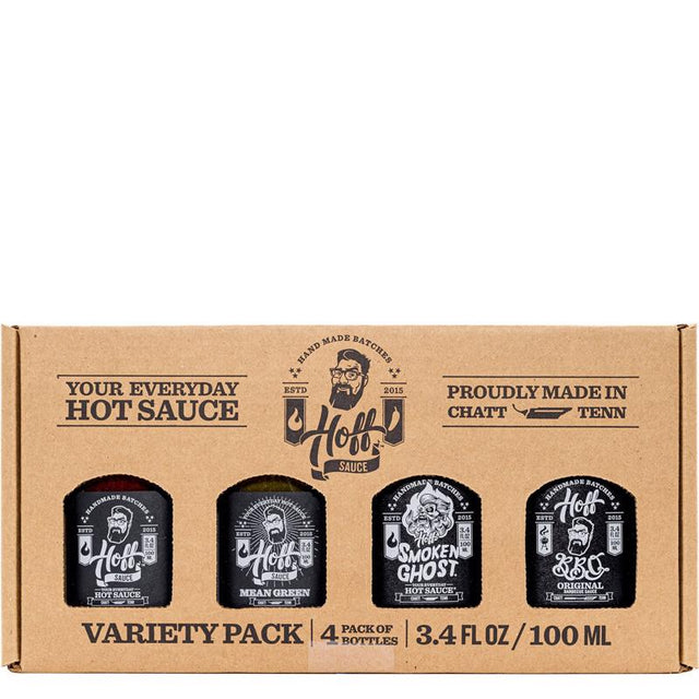 Hoffs 4-Pack Variety Gift Box includes everything a hot sauce lover could want. Each glass mini-flask is filled with our handmade spicy goodness and crafted with farm fresh Tennessee peppers. Our mini-flasks are TSA approved to carry on a plane and allow you to take our award winning sauces just about anywhere. With a sauce for any occasion this pack of small batch sauces is sure to please the spice lover in your life.