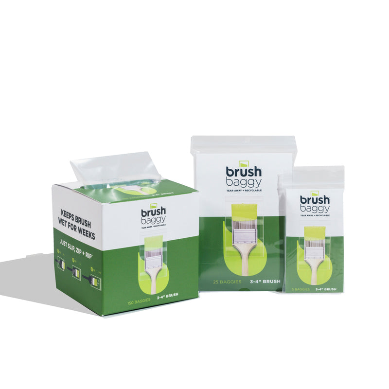 Most people agree washing their brushes isn’t an enjoyable experience. BrushBaggy is a specially designed zip top plastic bag, sized to enclose your paint brushes to protect them from drying out in between uses. Save hours in washing your brushes. Protect your tools and conserve water by waiting until the end of your project to wash out your brushes. Brushes go in easy and seal air tight. Sized for a 3-4 inch brush, these baggies come in three different levels of quantities - 5 pack, 25 pack, and 150 pack depending on the size of your project. Don't use messy plastic wrap or hard plastic shells that warp and still require cleaning - BrushBaggy is much better. The easy tear away design allows quick release of your brush so the paint mess is kept inside the bag - Slip, Zip and Rip!