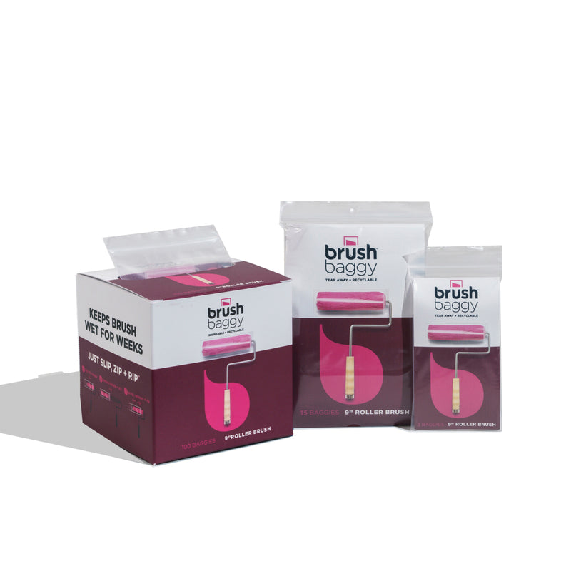 Most people agree washing their brushes isn’t an enjoyable experience. BrushBaggy is a specially designed zip top plastic bag, sized to enclose your roller brushes to protect them from drying out in between uses. Save hours in washing your rollers. Protect your tools and conserve water by waiting until the end of your project to wash out your brushes. Brushes go in easy and seal air tight. Sized for a 9 inch roller brush, these baggies come in three different levels of quantities - 3 pack, 15 pack, and 75 pack depending on the size of your project. Don't use messy plastic wrap or hard plastic shells that warp and still require cleaning - BrushBaggy is much better. The easy zip top opening allows you to use the bag more than once and the paint mess is kept inside the bag - Slip and Zip!