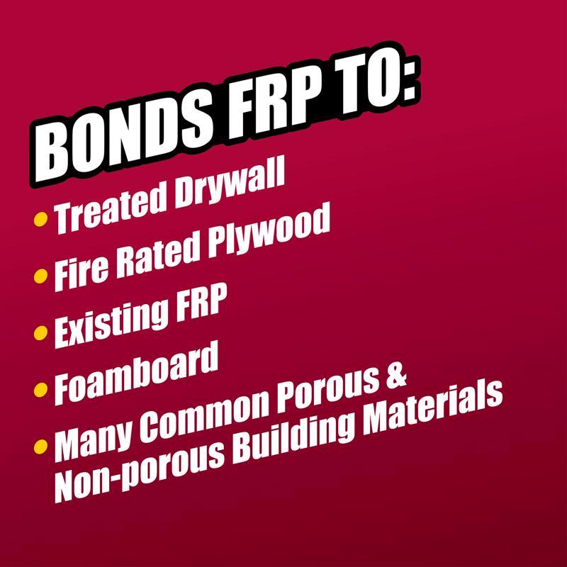 • RECOMMENDED FOR:INSTALLING FRP (FIBER-REINFORCED PLASTIC), PLASTIC LAMINATE, WAINSCOTING AND OTHER WALL COVERINGS OVER MANY COMMON POROUS AND NON-POROUS SURFACES.