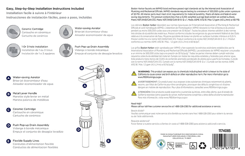 Boston Harbor FS6A0215BL Lavatory Faucet, 1.2 gpm, 1-Handle, 1, 3-Faucet Hole, Metal/Plastic, Matte Black