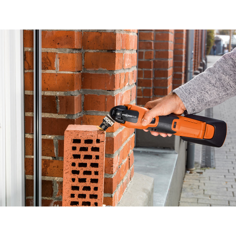 The all NEW FEIN E-Cut Carbide PRO multi-tool blade cuts through what others can’t. With titanium coated bi-metal carbide teeth and a TiN coating that helps the blade last 30x longer than traditional bi-metal blades, cutting through difficult materials has never been easier. The stainless steel construction of the Starlock mount and the high quality, high strength welds help to deliver optimal power transfer. It's the perfect choice for hard materials such as ferrous metals, stainless steel or copper pipes. Can even be used for tempered screws (Spax) and high-strength machine screws. Also ideal for abrasive materials like brick, masonry and cement fiber slabs, not to mention laminate, CFRP and GFRP. Strong cutting performance and cutting quality in all wood materials such as hardwood and particle board.
