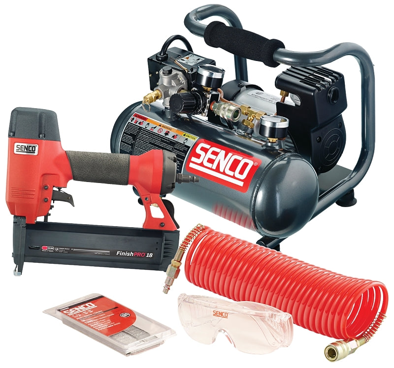 Everything to get you started on the job is included in this one package and at a price that creates an excellent value. The FinishPro18 brad nailer is a versatile nailer for all your finish needs. The Senco PC1010 compressor is a 1 hp (peak) 0.5 hp (running), 1 gal, oil-less portable air compressor. Its lightweight, rugged design will satisfy the needs of the pro.