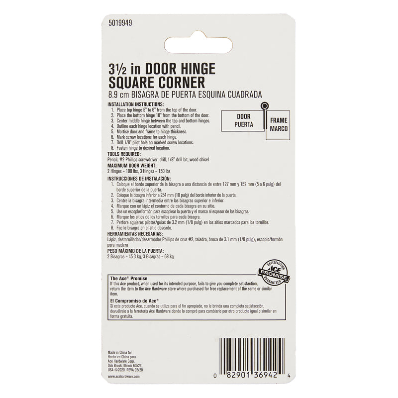 Ace 3-1/2 in. L Stainless Steel Residential Door Hinge 1 pk