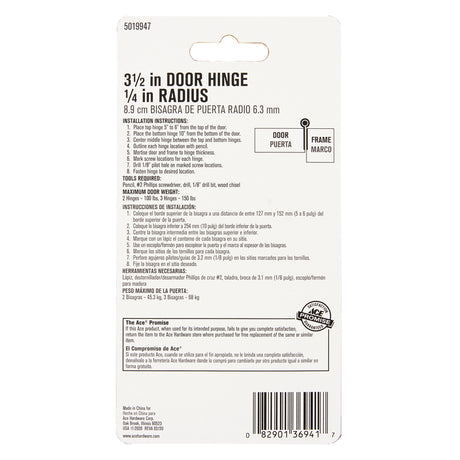 - Ace 3-1/2 in. L Satin Brass Residential Door Hinge 3 pk $12.94- $12.99Unit price /UnavailableIn stock (1889 units)