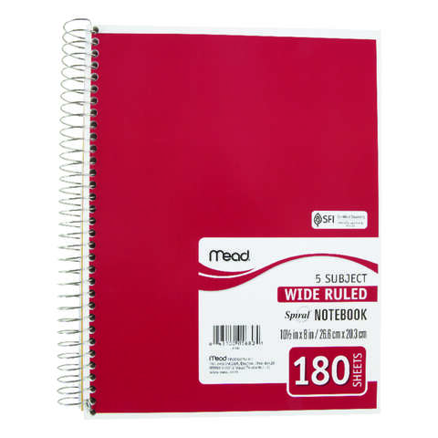 Convenient 5 subject notebook that is wide ruled and available in a variety of colors. It’s versatile and perfect for many uses including in-class note taking and recording meeting notes.