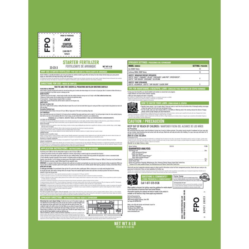 Ace Starter Fertilizer feeds your lawn in one easy step to establish lush new grass and encourage hardy root systems. This product feeds to help development of new grass plants and should be used when seeding, overseeding, sodding lawns and planting sprigs and plugs. Carries the Ace Promise satisfaction guarantee.