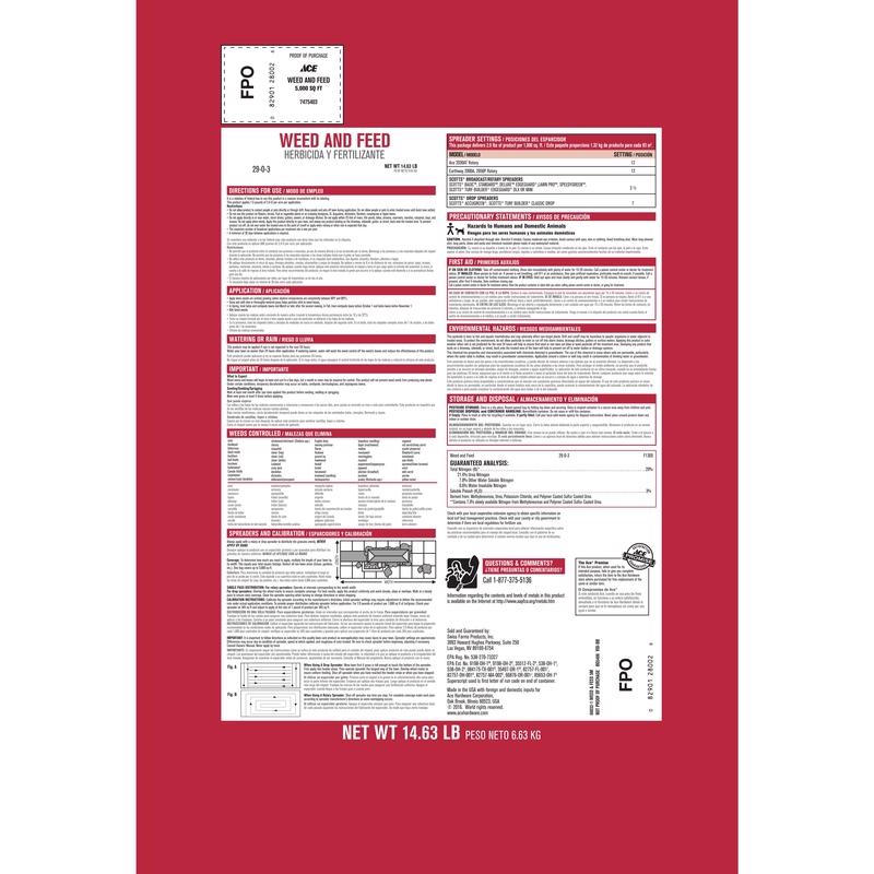 Ace Weed & Feed kills weeds and feeds your lawn in one easy step. This product kills dandelions, chickweed, white clover and most other common broadleaf weeds. Feeds your lawn up to 8 weeks to build strong, deep roots to protect from drought and heat. Apply when weeds are actively growing. Carries the Ace Promise satisfaction guarantee.