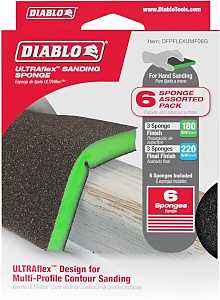 Diablo's premium ULTRAflex sanding sponges include break-through innovations that improve performance, extend sanding life and increase hand-sanding productivity. Featuring a premium aluminum oxide blend, these foam sponges remove material faster and offer up to 3X longer sanding life versus standard hand sanding sheets. ULTRAflex foam technology allows flexible, multi-profile contour sanding in hard to reach areas. The full contact design provides maximum sanding potential by delivering consistent scratch patterns and ultra-smooth finishes. The great grain bonding system, ENDURA-BOND, provides Diablo's sanding blocks with longer life and extreme durability.