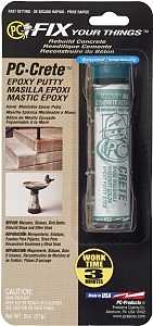 PC-CRETE epoxy is a hand-mixable, fast-setting epoxy putty that quickly repairs concrete and masonry. After mixing, it forms a concrete repair polymer that cures to a concrete-like color and texture. The mixture readily sticks to concrete and masonry surfaces and is easily shaped. It will stick to ceramics, glass, metals and some plastics. It cures within 60 mins. Each stick contains pre-measured portions of activator and base, no measuring or mixing tools are necessary.