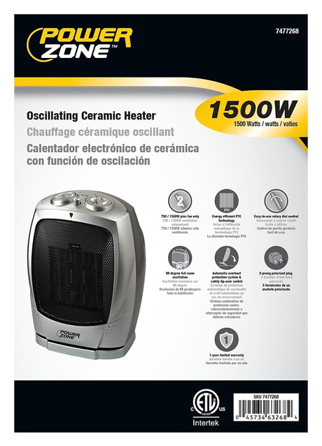PowerZone PTC-903B Ceramic OSC Heater, 12.5 A, 120 V, 750/1500 W, 2-Heat Setting, Gray