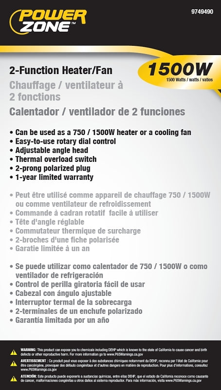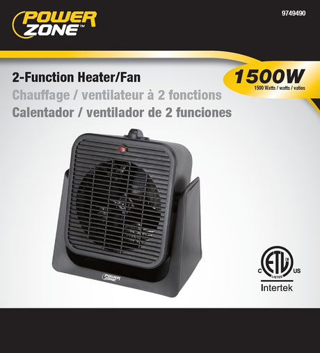 PowerZone SFH-181T 2-Function Heater/Fan, 12.5 A, 120 V, 750/1500 W, 1500 W Heating, Black