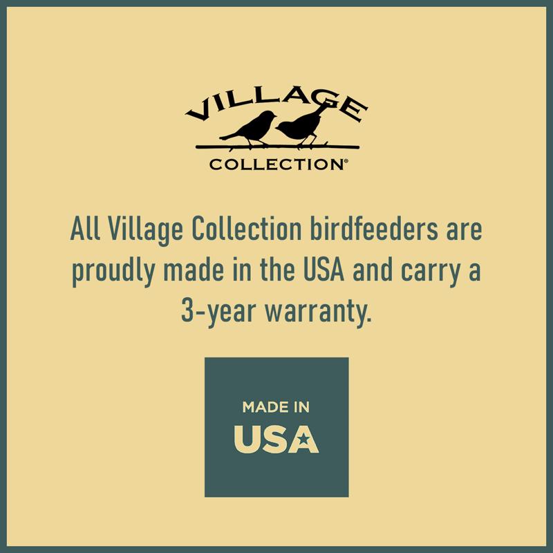 The yellow pinecone bird feeder is part of an extensive village collection of feeders. This hanging hopper birdfeeder is crafted out of lightweight plastic for strength and durability. For monitoring seed levels, the center chamber has two clear window panes. To fill the feeder, simply lift up the roof. This birdfeeder displays a nature-inspired pinecone design on the yellow side panels adding to the whimsical charm of the feeder.