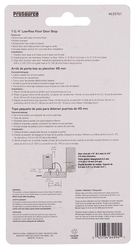 ProSource HR2006SC-PS Door Stop, 1-3/4 in Dia Base, 1-3/4 in Dia Base x 1-5/64 in H Projection, Brass