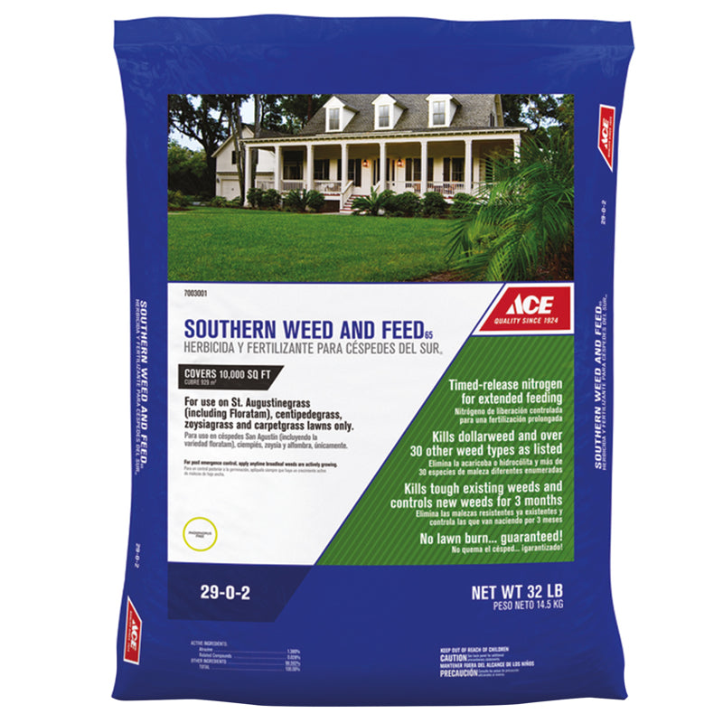 Ace Southern Weed and Feed65 kills over 30 weed types found in southern lawns, including dollarweed, chickweed, and oxalis. For use on St. Augustinegrass (including Floratam), centipedegrass, zoysiagrass and carpetgrass only. The timed-release nitrogen in Ace Southern Weed and Feed65 provides extended feeding and will not burn the lawn (when used as directed). Kills tough existing lawn weeds and controls new weeds for 3 months. Easily apply with an Ace Rotary; Earthway Rotary; or a Scotts Broadcast, Rotary, or Drop spreader, and water in immediately for best results. Carries the Ace Promise satisfaction guarantee. Get a thicker, stronger, greener lawn with Ace Southern Weed and Feed65.
