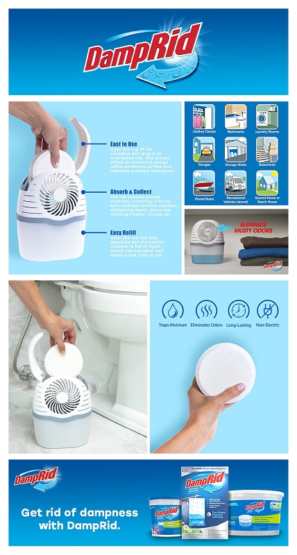 DampRid Reusable Drop-In Tab Moisture Absorber Starter Kit, 15.8 oz Net Content, Tablet Container, Solid Form, Fresh Odor/Scent, Blue, Compositions: Calcium Chloride, Sodium Chloride, Potassium Chloride, 2.15 Specific Gravity, Melting Point: 369 to 1420 deg F, 350 to 3500 deg F Boiling Point, 15.4 lb/gal Density, Suitable for: Bathroom, Basement, Bedroom, Boat, Camper or RV, Closet, Garage or Storage Unit, Kitchen, Laundry Room and Office, Includes: (1) Starter Drop-In Tab