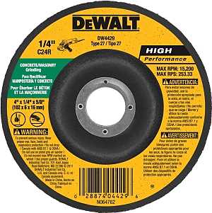 Powered by a high concentration of 100% virgin silicon carbide grain, DeWALT-type 27 masonry grinding wheels deliver aggressive grinding action and smooth-running wheels. 3 full sheets of fiberglass help to increase durability and safety. A proprietary design ensures long wheel life.