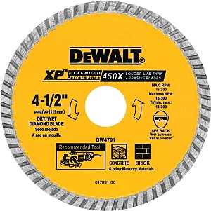 Packed with an extended performance diamond matrix that provides 350 times the life of conventional abrasives, DeWALT XP turbo blades offer helps to increased material removal and fast, easy cuts. Ideal for brick, block and tile applications. Delivers expedited cuts with less power requirements and a constant depth of cut without multiple blade changes.