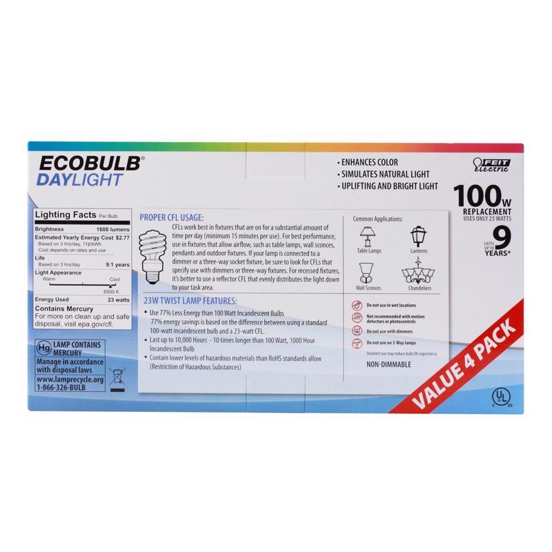 The Feit Electric ESL23TM/D/4 23-watt CFL Light Bulb is an energy-efficient replacement for incandescent bulbs. It produces a light output of 1600 lumens, using only 23 watts of electricity. Get Daylight Deluxe White (6500K) light, an ideal choice for vibrant, cool light that creates an alert mood. Feit Electric CFL bulbs have a relatively cool running performance and are RoHS/FCC compliant. They have an average life of 10,000 hours/9.1 years with an estimated annual energy cost of only $2.77. Choose a dependable general-purpose lighting bulb for residential or commercial applications.