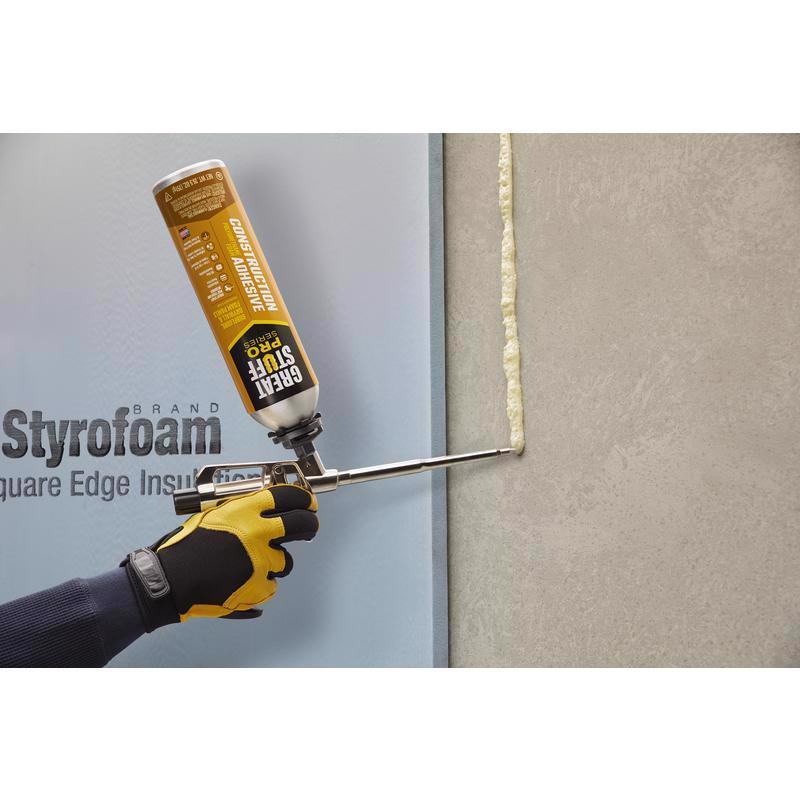 Great Stuff Pro Construction Adhesive provides a fast-grab tack and long-term high-strength bond, even in conditions that might stop traditional adhesives, leading to fast and reliable installations.